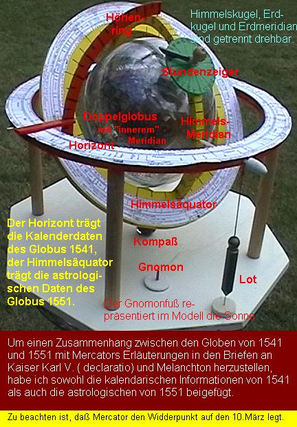 Die declaratio gibt Veranlassung, die beiden "mathematische Gerätschaften" aus ihrem dort beschriebenen Gebrauch zu rekonstruieren: einerseits gilt es, den "Doppelglobus" mit seiner interessanten mechanischen Struktur wiederherzustellen,Jan van Raemdonck, der zweite (große) Biograph Gerhard Mercators nach Walter Ghim, gab die declaratio, die man 1866 in der Form einer Abschrift in Mailand aufgefunden hatte, 1868 in St.Niklaas heraus. |